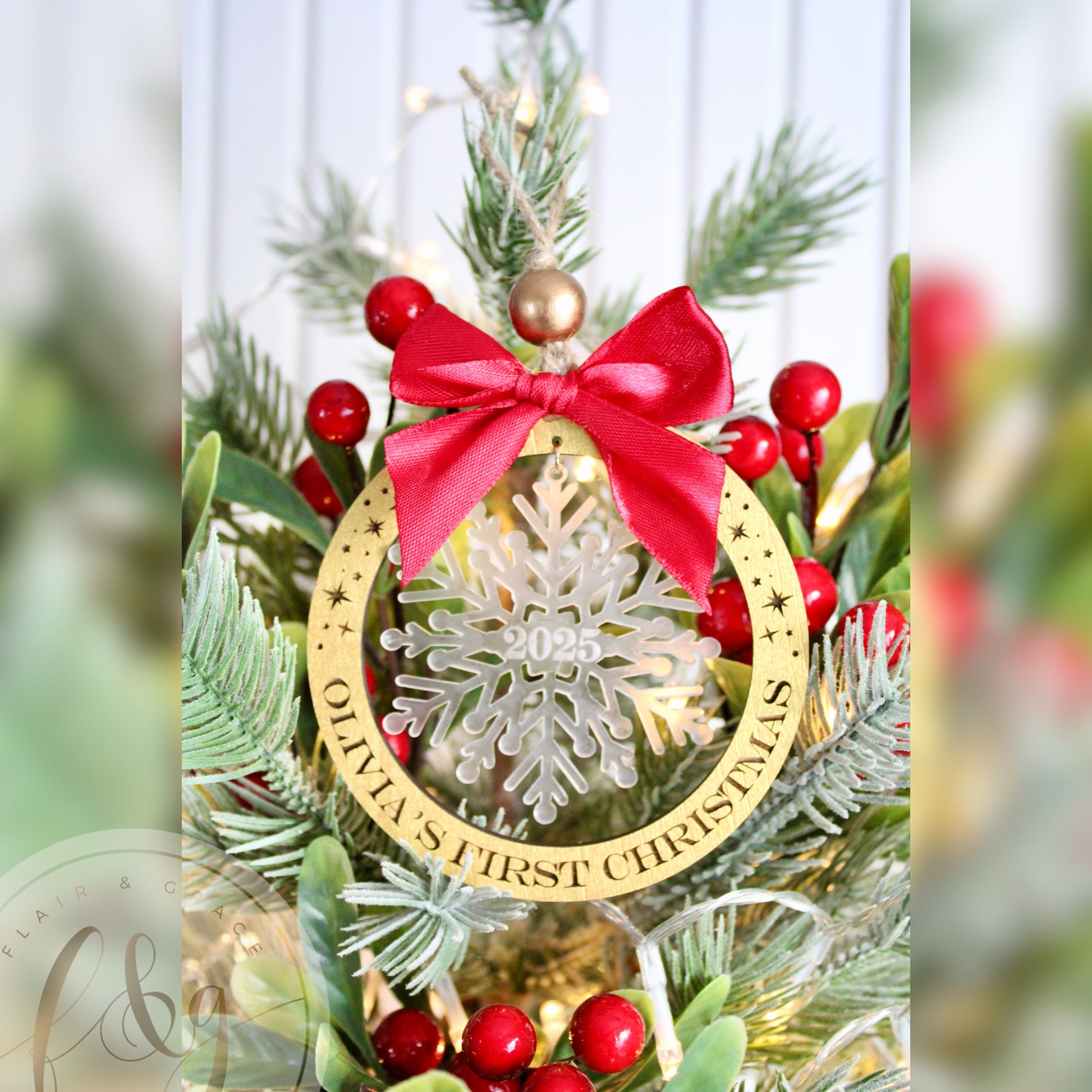 - Acrylic snowflake centerpiece with engraved year