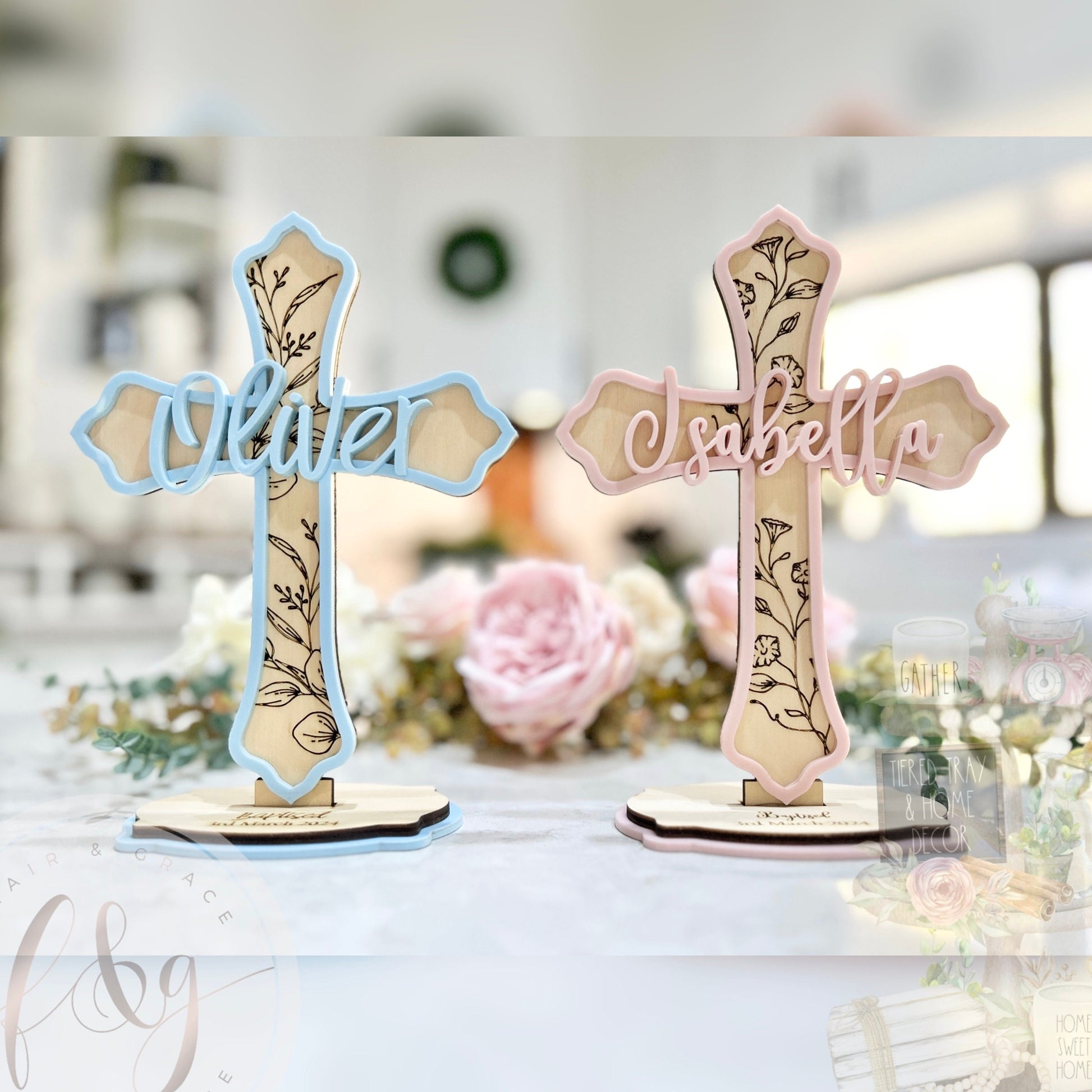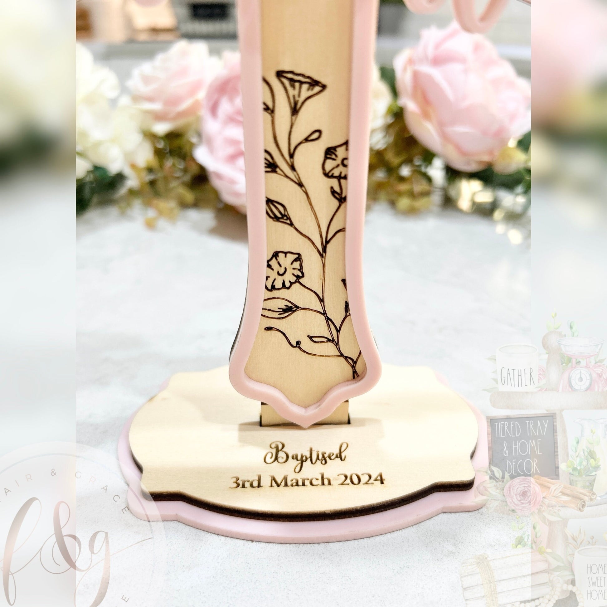 🙏 Our beautiful personalised Baptism cross features engraved details and date of Baptism. Customise it even further by choosing the Birth Flower or simple Eucalyptus design.