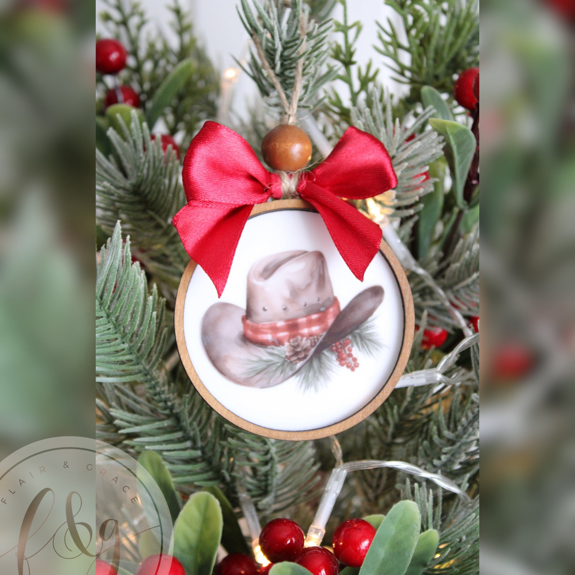 Each ornament features a rustic western-inspired design — from cowboy hats and boots to horses, wagons, longhorn skulls, and vintage trucks — all beautifully finished with festive florals, a red bow, and wooden bead detail.