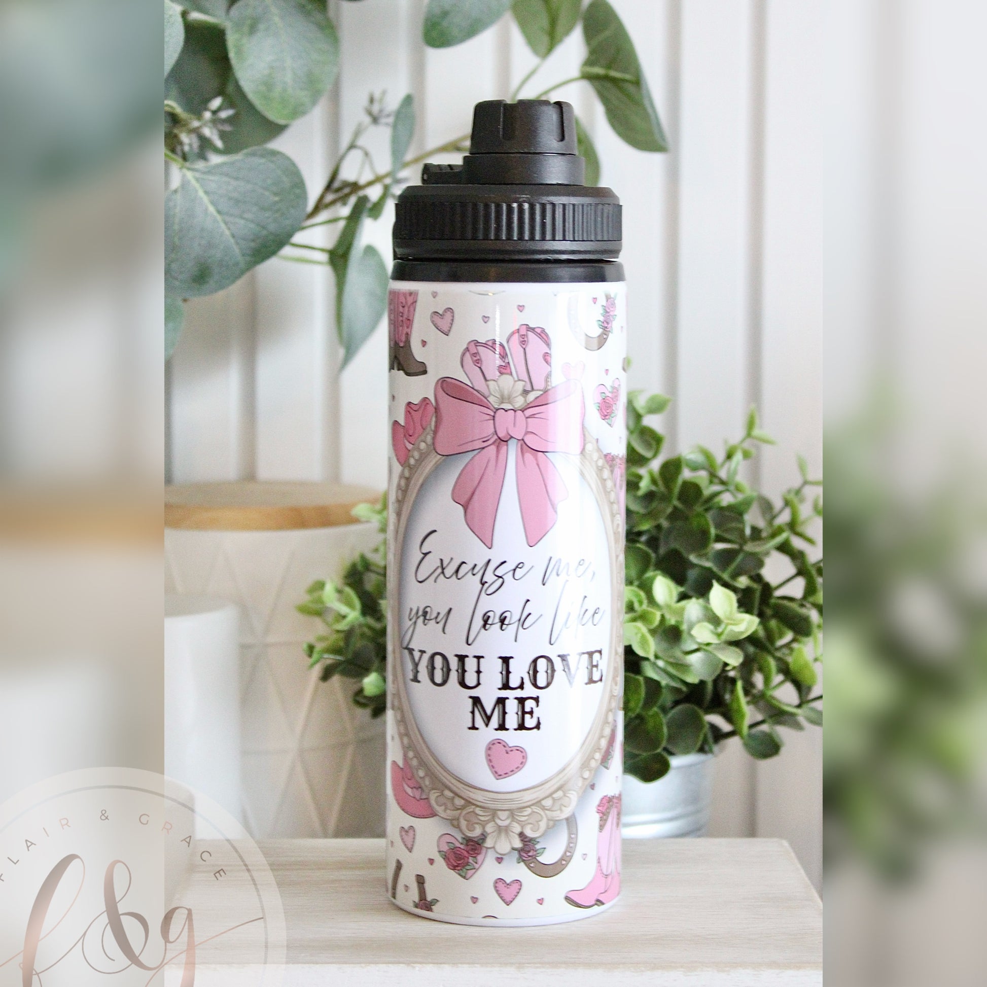 Take your country charm on the go! This aluminium tumbler features the a fun cowboy boot and hat pattern, with the playful phrase: “Excuse me, you look like you love me”. A must-have for western romance fans and country girls at heart.