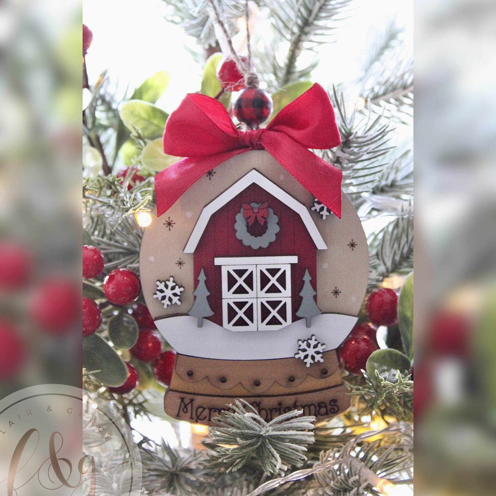Each ornament is carefully laser-cut and hand-finished in our studio, featuring layered wooden details, a bold red bow, and a touch of farmhouse plaid for that perfect rustic Christmas vibe.