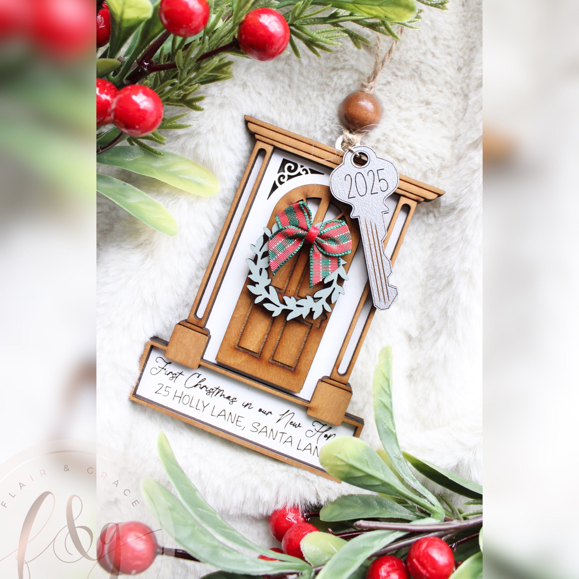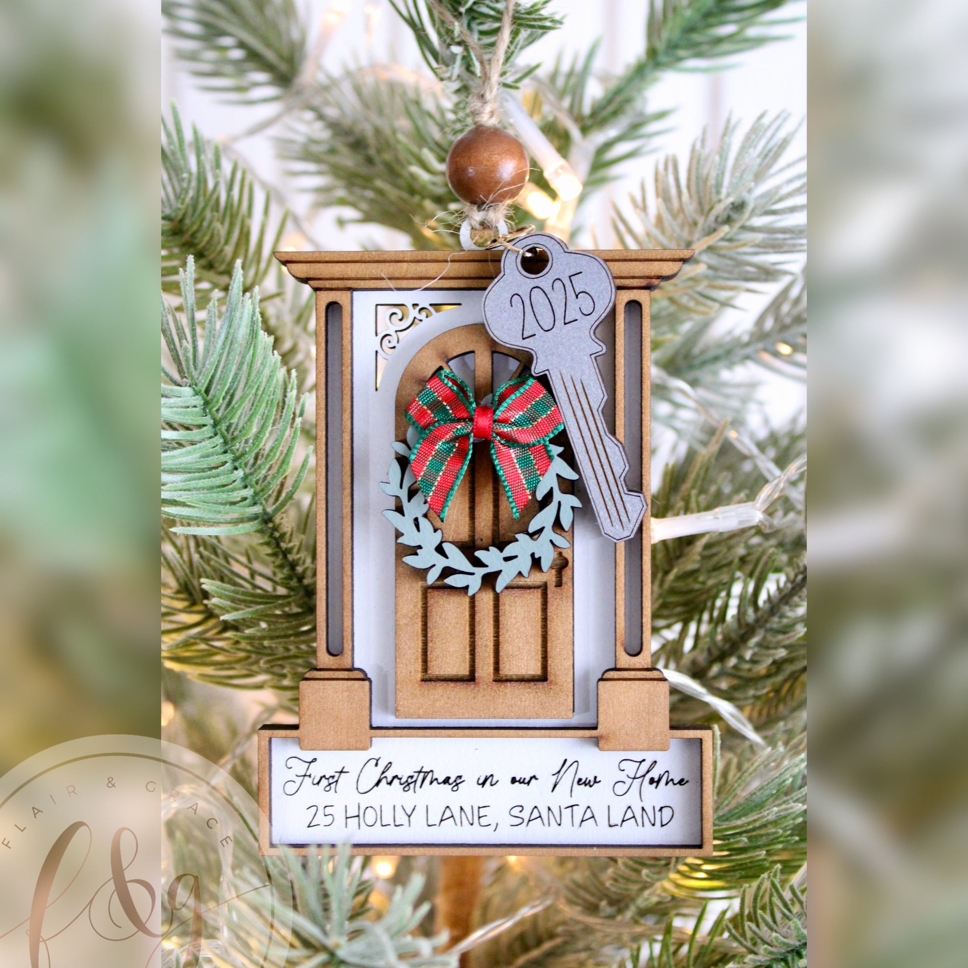 This beautiful ornament features a festive front door design with a wreath, bow, and hanging key charm engraved with the year. Personalised with your family’s address, it’s the perfect way to mark the milestone of your very first Christmas in a new place.
